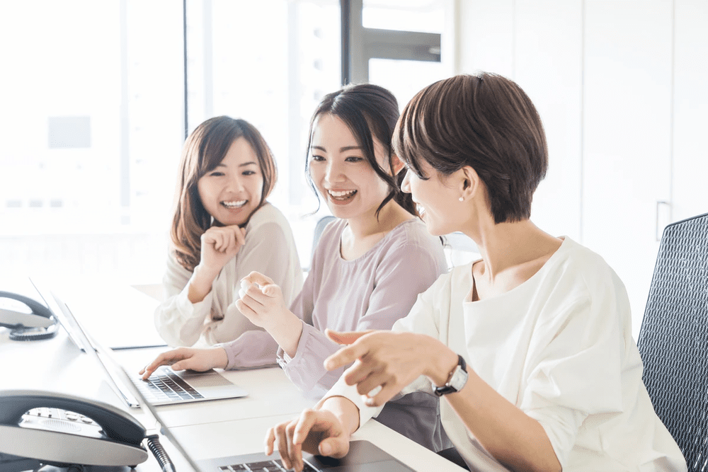 Three women sitting at a conference table with laptops, smiling and engaging in discussion in a bright office.